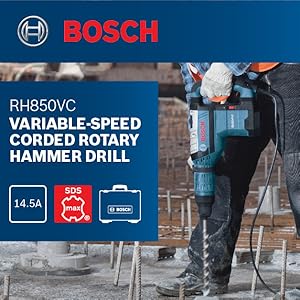 The BOSCH RH850VC SDS-max® 1-7/8 In. Combination Hammer is a professional-grade, corded electric rotary hammer featuring a robust 14.5-AMP motor that delivers 9.3 ft-lbs of impact energy. Designed for maximum user comfort, it incorporates advanced vibration control technology and a dual-mode selector for rotary hammer and hammer-only operation. With a variable-speed dial, turbo power boost, and tool-free SDS-max bit changes, this 20-lb powerhouse offers unmatched performance and versatility for demanding drilling and chiseling tasks.