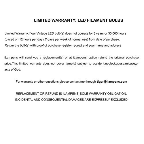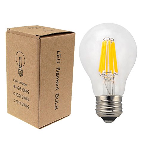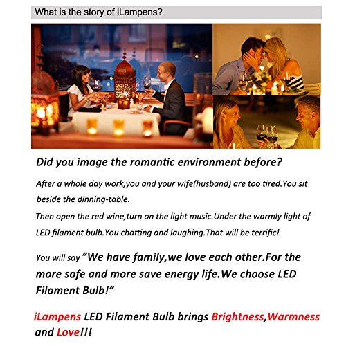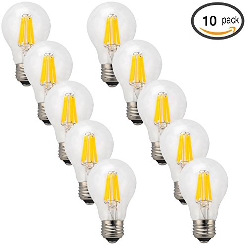 iLampens A19 10W led filament bulb candelabra 100w Equivalent 1000 Lumen 2700K E26 Socket Non-dimmable UL Listed (10 Pack) Specifications: Item Type: LED filament bulb Brand Name:iLampens Light Base: E26 Beam Angle: 360 degree Input Voltage(V): AC 120V Lamp Power(W): 10 Lumen: 1000LM CRI (Ra>): 84 CCT: 2700K Glass Lens: Clear Working Lifetime(Hours): 25,000 Operating Temp. -20~40℃ Warranty: 3 years Gross Weight of each piece: 0.5 kg/pcs Package size of each piece: 65*65*120 mm Product size:60*108 mm Features: Our LED filament bulbs turn on instantly to full brightness with no delay. When the bulbs work,put your hands beside them.You will feel warm not hot,it must cooler than tranditional bulbs.Beacuse we fill some gas(helium & nitrogen) inside the bulbs,which will exchange the heat between inside and outside. Package include: 10 x E26 10W LED filament bulb 10 x Package (Packed Safely in Bubble Bag)