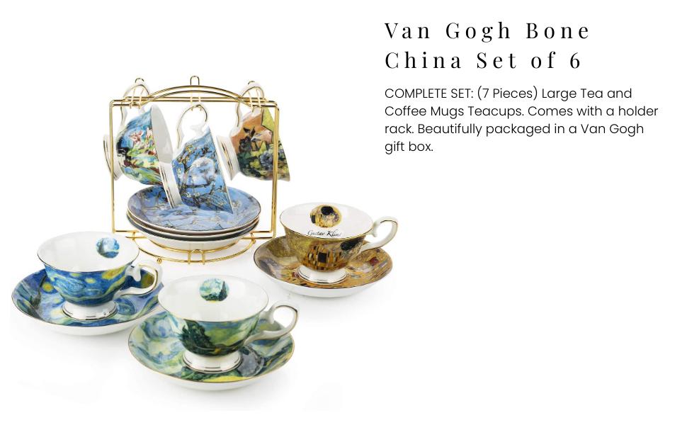 The Van Gogh Bone China Set includes 6 beautifully crafted cups and saucers, each featuring intricate designs inspired by Van Gogh's art. This 7-piece set comes with a stylish holder rack and is elegantly packaged in a gift box, making it a perfect choice for entertaining or gifting.