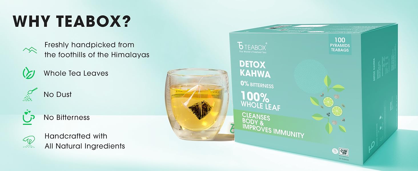 Teabox Detox Kahwa Herbal Tea offers 100 biodegradable pyramid tea bags crafted from 8 natural, organic ingredients including green tea, holy basil, and spices. This caffeine-free, 0% bitterness blend delivers a fresh, aromatic, and smooth detox experience, sealed for freshness and designed for eco-conscious, health-driven professionals.