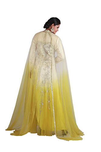IF-3140/3-20 pannel kaftan in shaded net with an extra tara jacket . Colours being skin beige with yellow. Machine antique silver embroidery done allover front and back. Another colour beige and turquoise green.