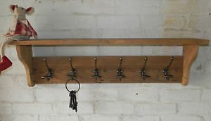 1 x Hand made Coat and Hat rack with shelf and your choice of 3,4,5,6,7 or 8 hooksHand made from natural antique aged pine coat and hat rack with wide cast antique iron waxed coat hooks. Listing is for rack with shelf and hooks only Every single rack is unique in it`s natural beauty as wood itself contains natural aged features Wood has reached its colour from natural ground coffee finish so is super Eco friendly To hang it by the wall I have made nicely looking screw holes,all You will have to do is take 2 screws and screw them straight in the wall Dimensions of Rack: approx. Height: 25 cm/ Depth: 14.5 cm and length as follows:3 Hook 58cm Wide4 Hook 68cm Wide5 Hook 78cm Wide6 Hook 88cm Wide7 Hook 98cm Wide 8 Hooks 108cm Wide