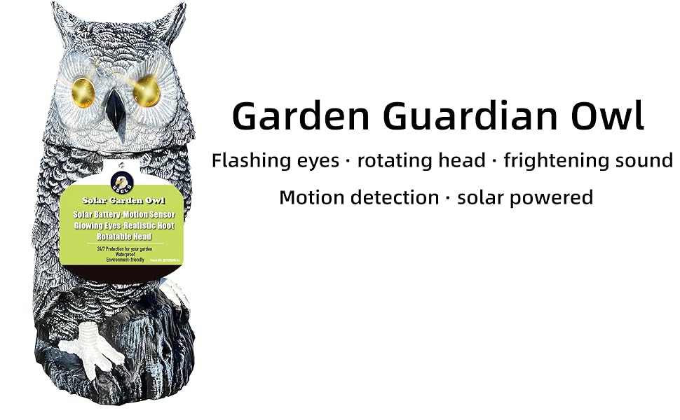 The Ugold Solar Powered Snow Owl is a 14.7-inch premium PE garden sculpture featuring a patented lifelike design with glowing eyes, rotatable head, and realistic hoots triggered by a built-in sensor. Solar-powered with a USB backup cable, it offers silent mode for sound control and is ideal for both indoor and outdoor decoration.