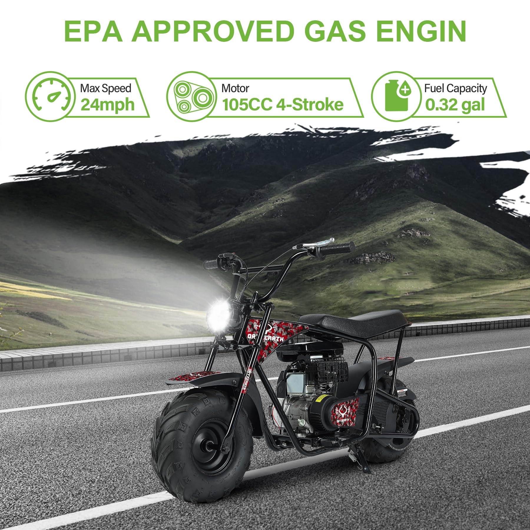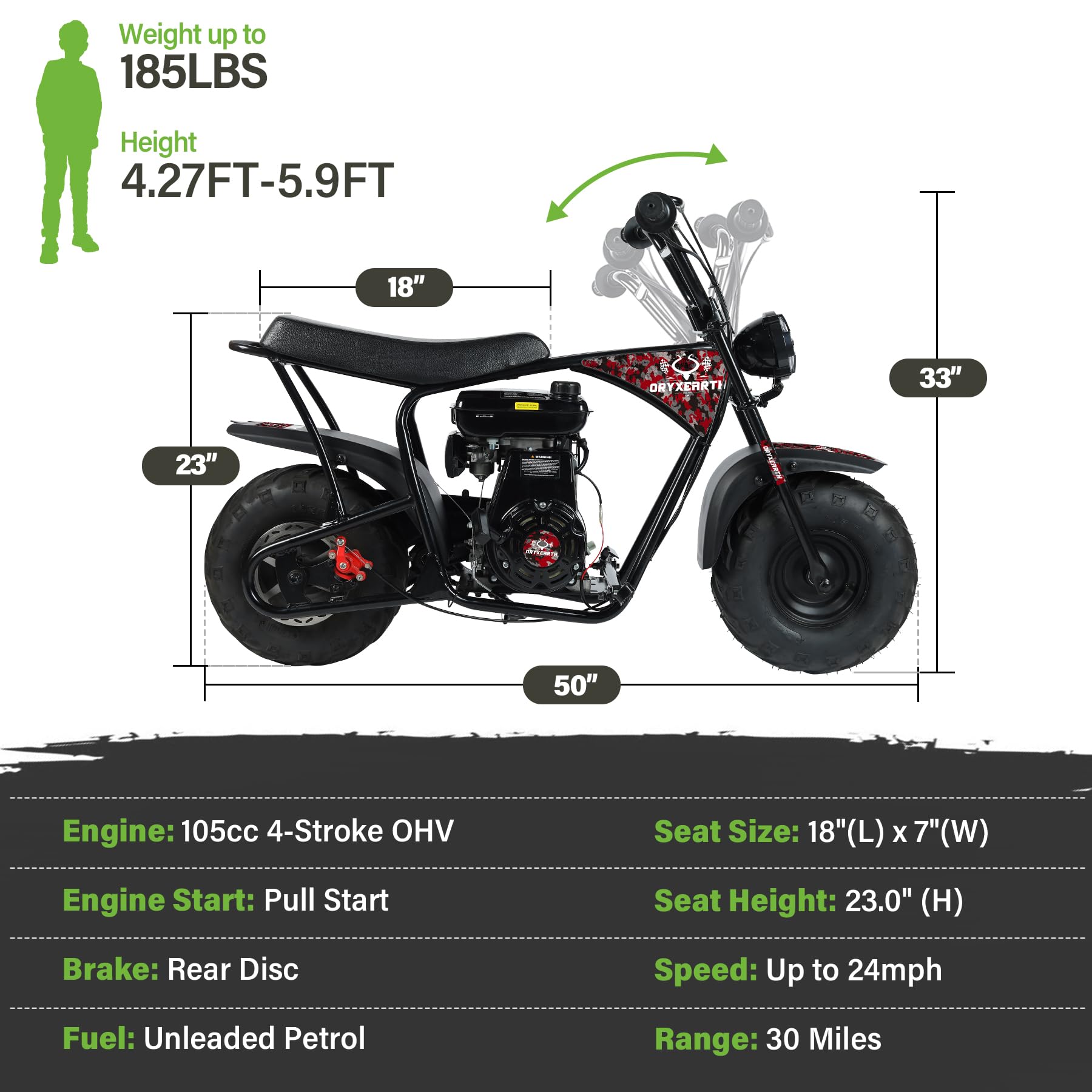 The Oryxearth Dirt Bike for Kids features a powerful 105cc 4-stroke engine, designed for riders aged 4.27FT-5.9FT and under 185LBS. With a top speed of 24 mph and a cruising range of 30 miles, this bike combines safety and fun with a sturdy metal frame, low-pressure tires, and easy operation. EPA approved and nearly fully assembled, itβs the perfect choice for young adventurers!