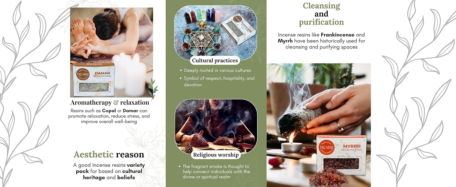 The TRUMIRI Resin Incense Variety Pack includes six 30g packs of natural tree gum sap resins, featuring scents like frankincense, myrrh, copal, benzoin, dragon's blood, and damar. Perfect for meditation, prayer, or relaxation, this premium incense offers a holistic experience and exceptional value.