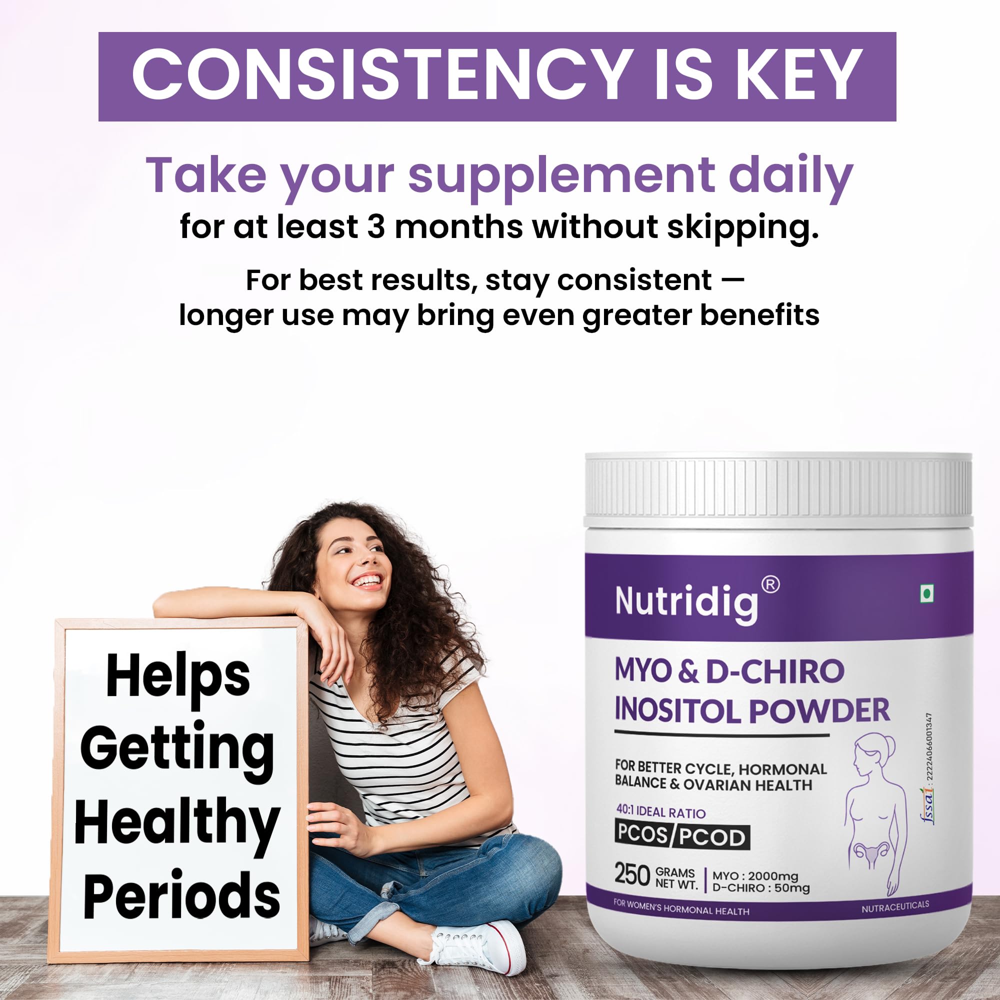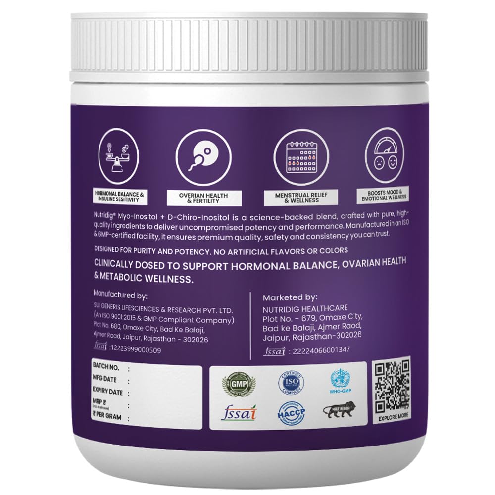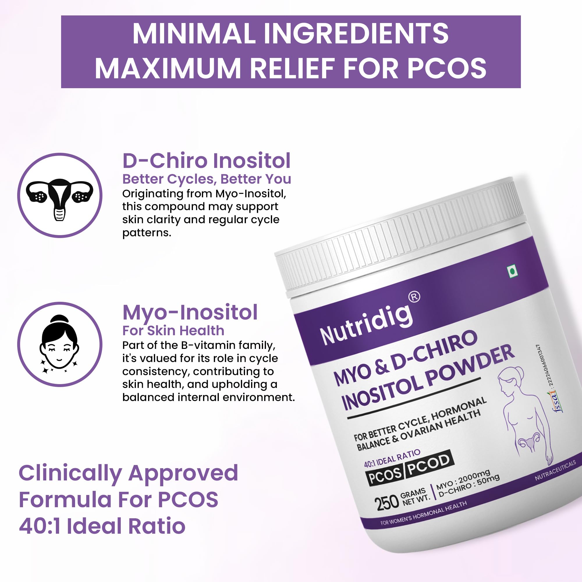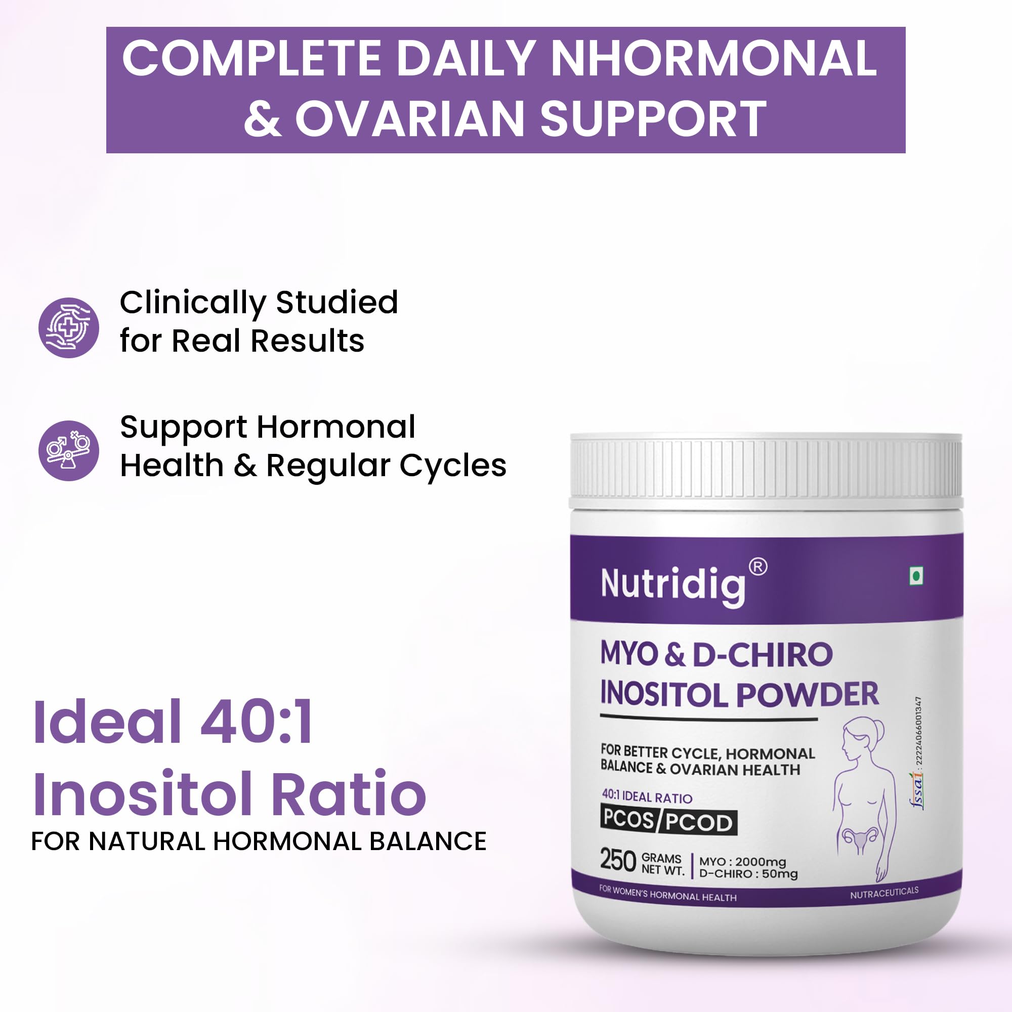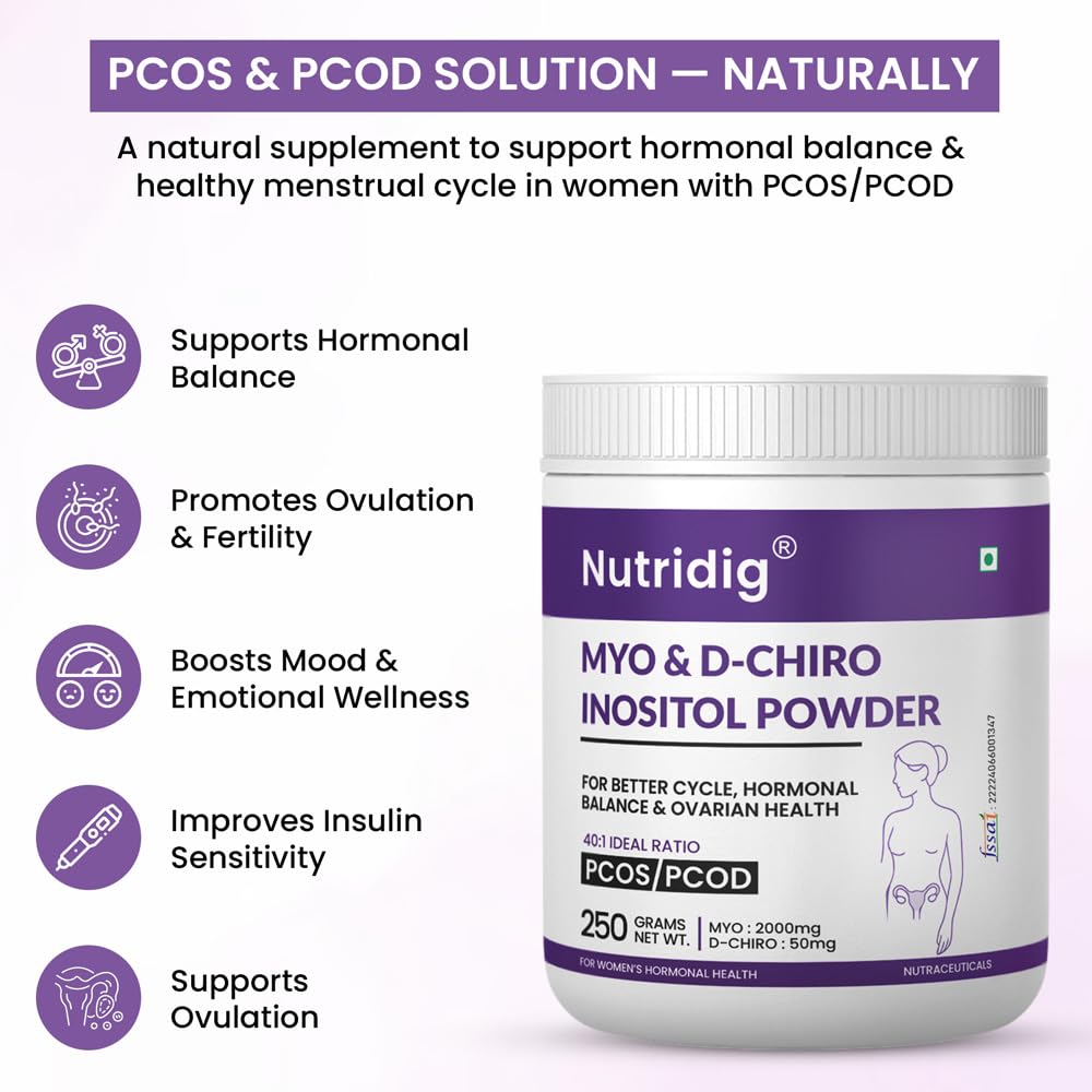 Nutridig® PCOS Care is a premium, science-backed powder supplement featuring the ideal 40:1 ratio of Myo-Inositol to D-Chiro Inositol. Designed specifically for women managing PCOS, it supports hormonal balance, menstrual regularity, and healthy ovarian function. Made from 100% pure, lab-tested ingredients in a GMP-certified facility, this non-GMO, gluten-free formula promotes clearer skin and overall hormonal wellness when used consistently.