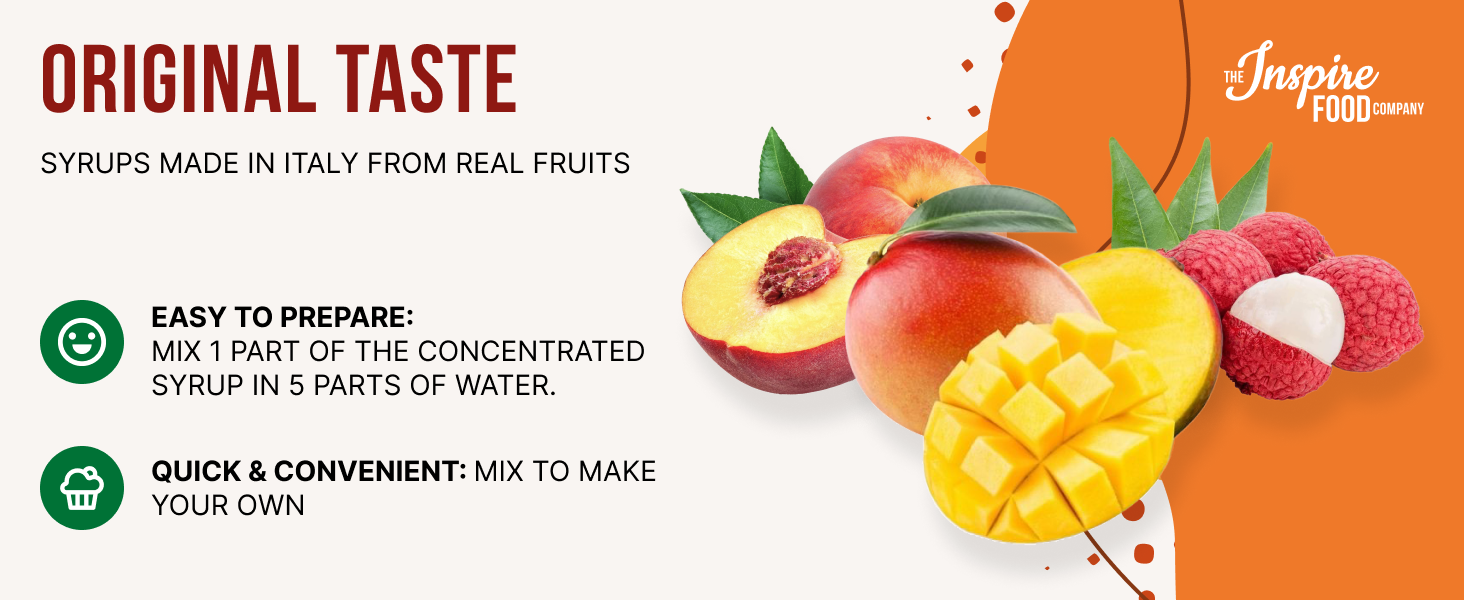 Inspire Food Fruit Syrup 3-Pack delivers premium Lychee, Peach, and Mango flavors in 300ml bottles, designed for quick, versatile use in bubble tea, smoothies, and desserts. Made in Italy, these 100% vegetarian, gluten-free syrups blend easily (1:5 ratio) to create vibrant, authentic drinks and treats that cater to health-conscious millennials seeking both convenience and exotic taste.