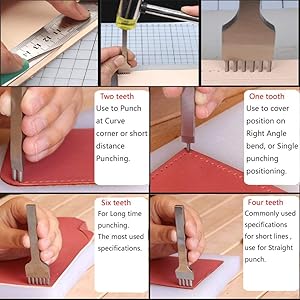 The 4pcs Leather Chisel Tool Kit by Medoga features a set of high-quality white steel chisels with 1, 2, 4, and 6 prong options, designed for various leather crafting needs. Each chisel is engineered for precision, with a prong width of approximately 2.5mm and a pitch of 4mm, making it ideal for DIY projects like belts, gloves, and handbags. The tools are lightweight at 90g and come with a rust preventive coating for enhanced durability.