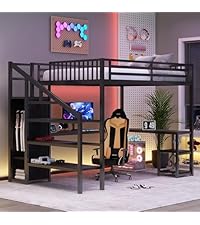 This full-size black metal loft bed by Mirightone combines space-saving design with multifunctional features including a built-in desk, charging station (2 USB ports + 2 outlets), and remote-controlled RGB LED lighting. Engineered with a heavy-duty steel frame supporting up to 300 lbs and equipped with full-length safety guardrails, it ensures durability and safety. The bed also offers extensive storage options with a wardrobe, bookcase shelves, 4 fabric drawers, and a bench, complemented by wide wooden ladder rungs for comfortable access. Perfect for small apartments, dorms, or modern bedrooms seeking style and efficiency.