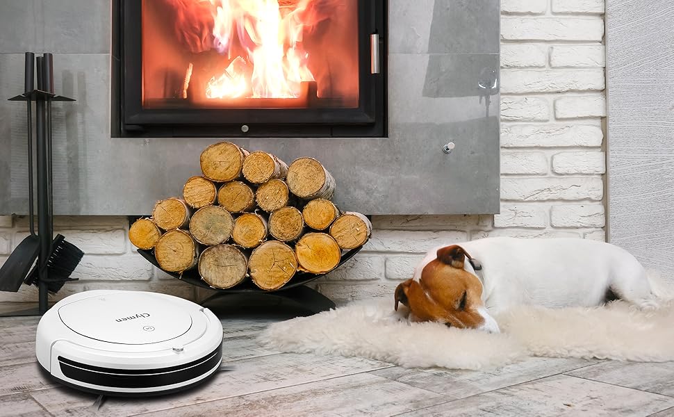 The media could not be loaded. Absolutely loving clymen q9. Ive had it a week now and would definitely recommend it to someone who like me has hard wood / laminate flooring and dogs or cats . Its my first robot hoover and it exceeded my expectations. It connected to my app , it connected to my alexa really easy . The scheduled cleaning works every time so my house is clean when im back from work ! , the dust container is big enough to complete whole downstairs ( lounge , kitchen , hall, toilet) , mop function works beautifully . Ive got very high shaggy rug which the robot cant do but i thought that before buying it anyway so not a problem . Aww and i put docking station under my kitchen table / by the wall - it always finds it ! My dog is not interested so not chasing it around :)
