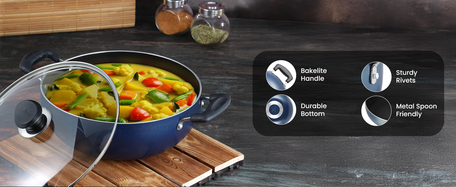 The VinodZest Non-Stick Deep Kadai is a 3.1-litre capacity cooking essential, featuring a durable 3-layered non-stick coating, riveted Bakelite handles, and compatibility with gas and induction stovetops. Its stylish blue design and easy-to-clean surface make it a must-have for modern kitchens.